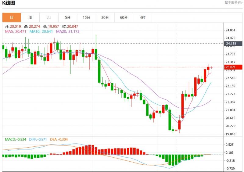 周五欧市盘中,现货白银报23.066,跌幅0.06%。