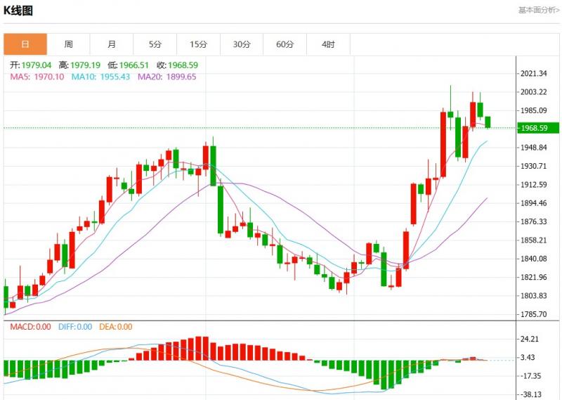 周一欧市盘中,现货黄金报1969.08,跌幅0.53%。