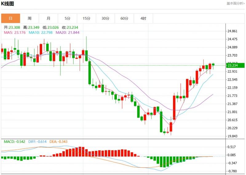 周三欧市盘中,现货白银报23.233,跌幅0.31%。