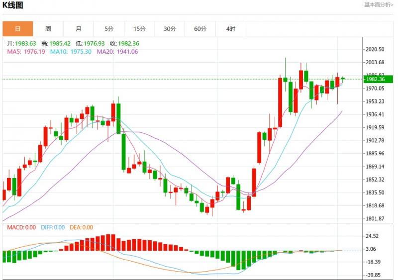 周二欧市盘中,现货黄金报1982.29,跌幅0.07%。