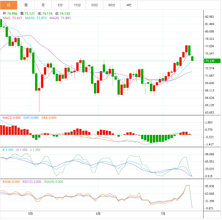 美原油延续上周五跌势,一度刷新四个交易日低点至74.31美元/桶,中国二季度GDP沪深弱于市场预期,打压了原油需求前景预期,另外,利比亚油田周末恢复生产,增加了供给担忧;短线留意100日均线附近73.52附近支撑。