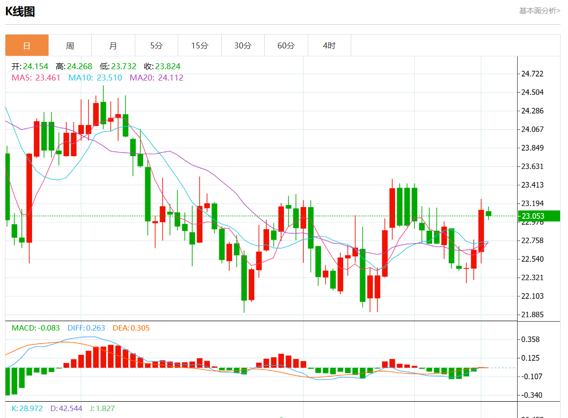 周一欧市盘中,现货白银报23.078,跌幅0.17%。