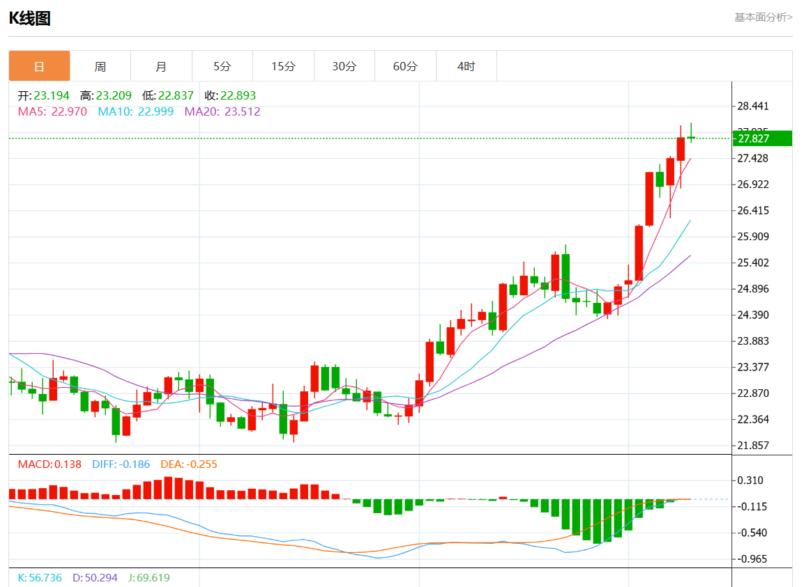 周二欧市盘中,现货白银报28.050,涨幅0.75%。
