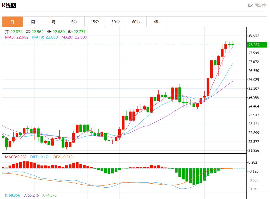 周三欧市盘中,现货白银报28.050,跌幅0.21%。