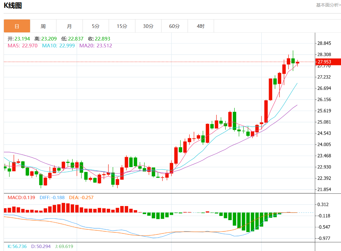 周四欧市盘中,现货白银报27.850,跌幅0.18%。