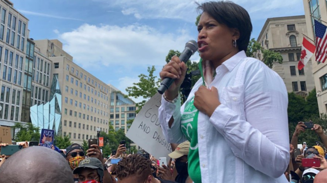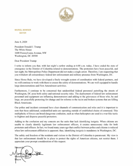 6月4日,她写信给特朗普,表示抗议者是在和平示威,目前已经没有暴力事件发生,要求“撤回所有驻扎在华盛顿的联邦执法力量和军事存在”。此外,她在信中指出,身份不明的联邦执法人员在华盛顿巡逻,将使局势变得危险而混乱。