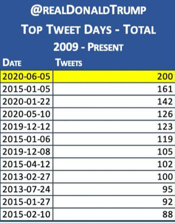 一连串的推特发出来,还让特朗普“歪打正着”破了一项纪录——单日发推200条,打破了此前也是由他自己保持的161条纪录,再次成为“推王”。
