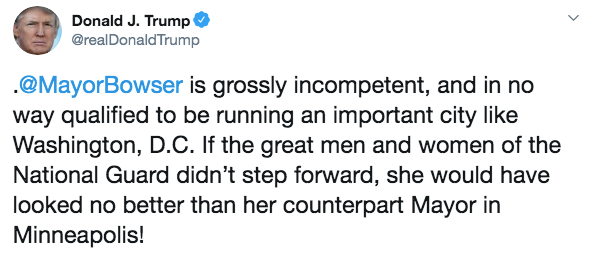 “她是华盛顿特区的无能市长,财务预算完全失控,常常找联邦政府施舍,而她现在还在和过去几晚让她不至于太难堪的国民警卫队对着干。”