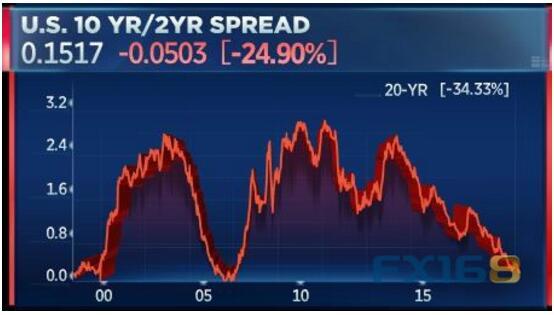 目前,这两种债券的收益率差略低于15个基点,为2007年6月最后一次倒挂以来的最低水平。