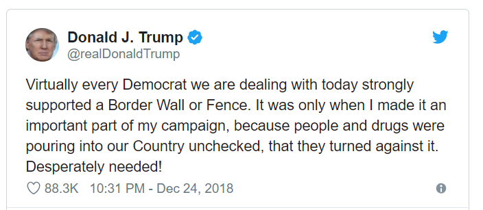 美国总统唐纳德?特朗普(Donald Trump)在圣诞节前一天加大了指责民主党关闭政府的力度。两周前,他在椭圆形办公室(Oval Office)公开表示,他会很自豪地关闭政府,以获得边境资金。特朗普在推特上坚称,正如他经常做的那样,民主党高层在他就职前曾支持一道边境墙: