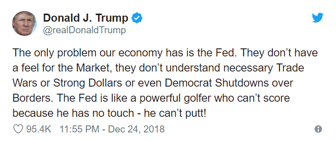 美联储也成了总统的靶子。央行上周再次加息,尽管贷款利率仍处于历史低位,但股市再次出现抛售。