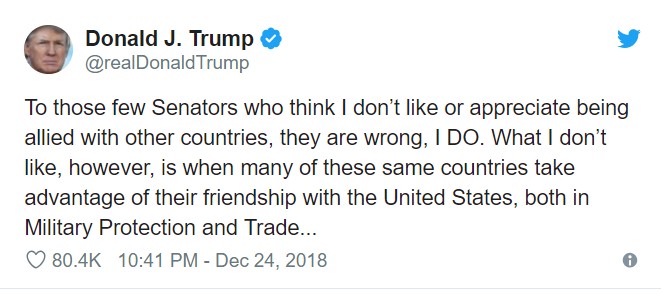 这就是总统为他从叙利亚撤出数千名美国士兵的决定辩护的方式。美国军队一直在叙利亚与伊斯兰恐怖组织ISIS作战。在他声明的观点中,美国正在资助军队或富国,并进行其他国家应该进行的战斗: