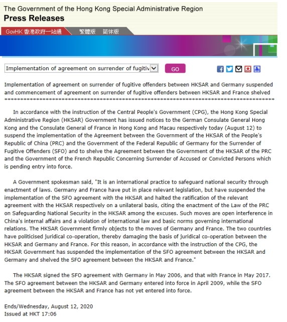 香港特区政府发言人表示:“通过法律维护国家安全,是国际惯例。德国及法国都订立了相关法例,但却以《中华人民共和国香港特别行政区维护国家安全法》等事项为借口,分别单方面暂停履行与香港特区签订的移交逃犯协定和暂停批准与香港特区的有关协定,公然干涉中国内政,违反国际法和国际关系基本准则,香港特区政府对此坚决反对。德方及法方将司法合作政治化,损害了香港特区分别与德国及法国之间开展司法合作的基础。为此,香港特区政府按中央人民政府的指示,暂停履行港德移交逃犯协定及搁置港法移交逃犯协定。”