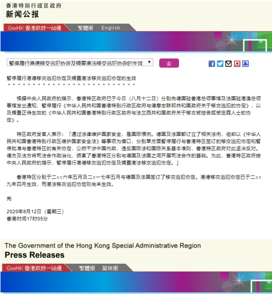 对于法国、德国宣布暂停与香港的引渡条约之后,8月12日,香港特区政府发声明称,暂停港德港法移交逃犯协定。