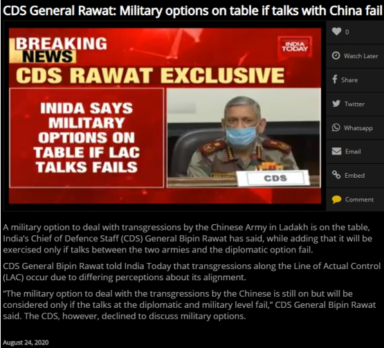 印度国防参谋长拉瓦特(Bipin Rawat)8月24日对《今日印度》说,解决中国军队在拉达克地区的越界行为的军事选项摆在桌面上。他还补充说,只有在两军之间的谈判和外交选择失败的情况下,才会动用军事选项。