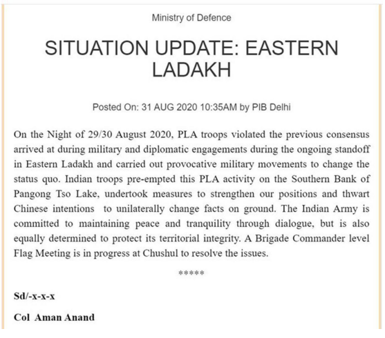 印度军方8月31日发表声明说,2020年8月29日和30日晚,中国人民解放军违反先前在拉达克(Ladakh)东部对峙期间经由军事和外交接触达成的共识,采取挑衅性军事行动改变现状。声明称,印度军队先发制人,在班公湖南岸采取措施加强了印度的阵地,挫败中国单方面改变地面事实的意图。