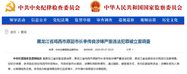 中央纪委国家监委网站讯据黑龙江省纪委监委消息:黑龙江省鸡西市原副市长李传良涉嫌严重违法犯罪,黑龙江省监委依法对其进行监察调查。经初步调查,李传良在担任鸡西市财政局长、市政府副市长期间,涉嫌利用职务便利,通过骗取、侵吞等方式,贪污巨额国有资金;涉嫌收受他人贿赂;长期搞钱色交易。李传良为躲避调查目前已逃至境外,并向境外转移部分涉案赃款。