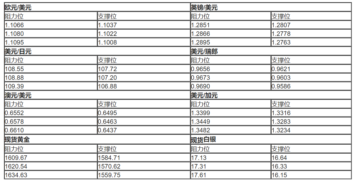 本文提供美元指数、欧元、英镑、日元、瑞郎、澳元、加元及黄金支撑阻力位。