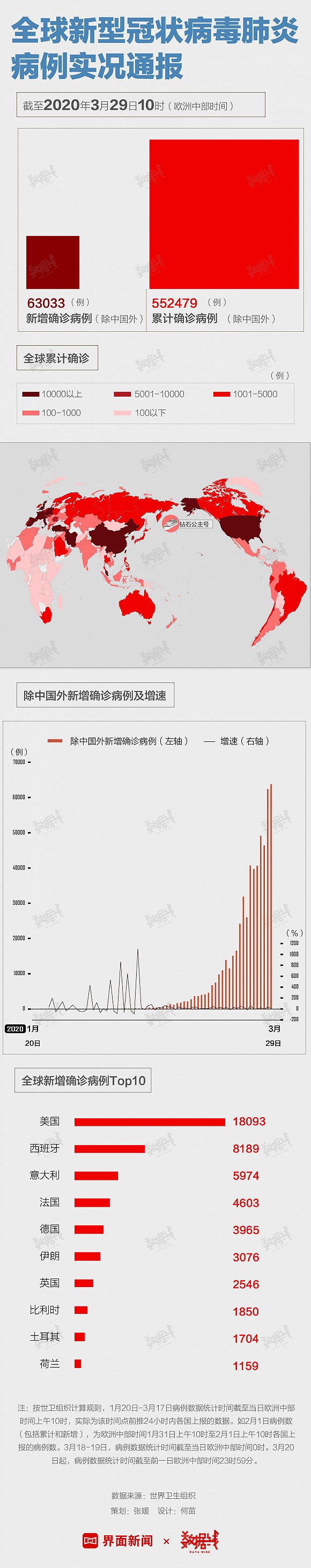 据世界卫生组织(WHO)数据,截至欧洲中部时间2020年3月29日10时,全球累计报告确诊新型冠状病毒肺炎病例63.4835万例。除中国外,全球新增确诊病例6.3033万例,较昨日同比上升1.08%,涨幅回落33.42个百分点。