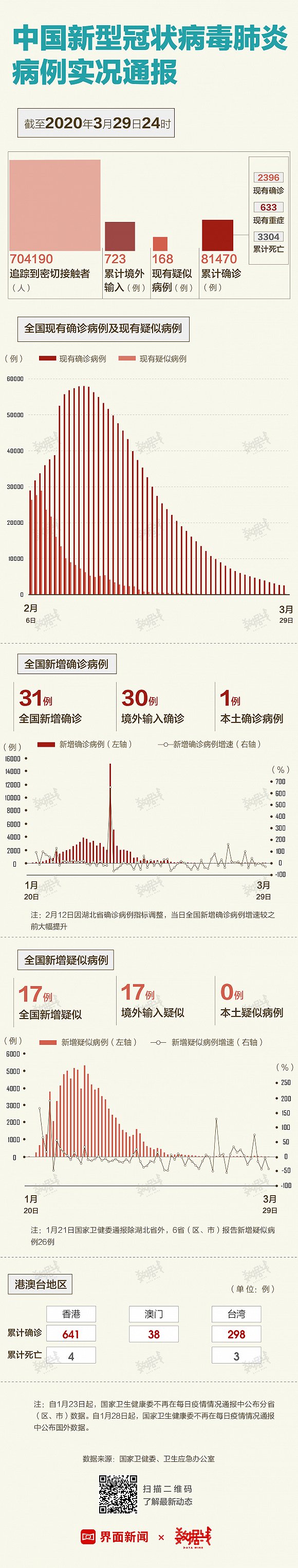 在中国,据国家卫健委数据,3月29日0—24时,31个省(自治区、直辖市)和新疆生产建设兵团报告新增确诊病例31例,其中境外输入病例30例,本土病例1例(甘肃)。3月28日,45例新增确诊病例中,也包含1例本土病例(河南)。