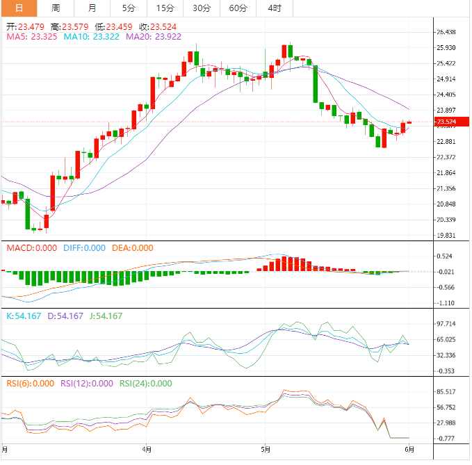 从5月5日开始向下倾斜的趋势线和两周前的下行阻力线的汇合,似乎对白银在23.60美元附近的买家构成了挑战。