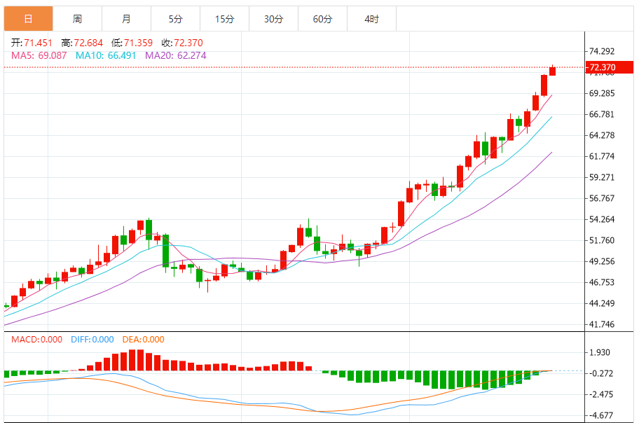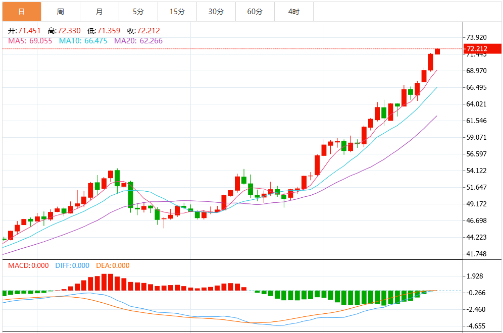 银价(白银/美元)在周三的交易中约为72.05美元,日内上涨0.70%。 白银延续其看涨势头,连续第四天上涨,并在当天早些时候达到72.71美元的历史新高,显示出投资者对贵金属的持续需求。
