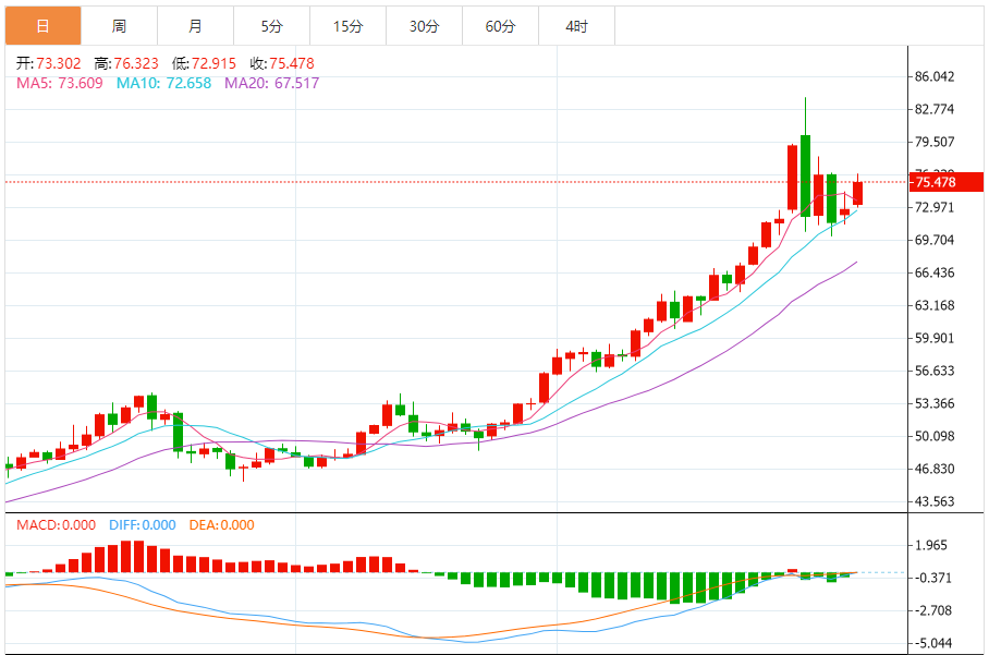 从最新的技术指标观察,白银短期走势呈现强势上攻姿态,但部分指标暗示市场已进入关键区域,需警惕技术性调整。技术图显示,价格当前已运行至布林带(BB 20,2)中轨73.661美元上方,并向上轨77.078美元方向测试。布林带开口向上扩张,显示短期上涨动能充沛。然而,MACD(26,12,9)指标呈现微妙信号:DIFF值为0.237,DEA值为0.374,柱状线为负(-0.276)。这通常意味着尽管价格在上涨,但上涨的动能(DIFF)尚未超越平均动能(DEA),市场可能存在短期内的动能背离或整理需求。RSI 14 读数位于53.664,处于中性偏强区域,尚未进入超买,为后续上行。