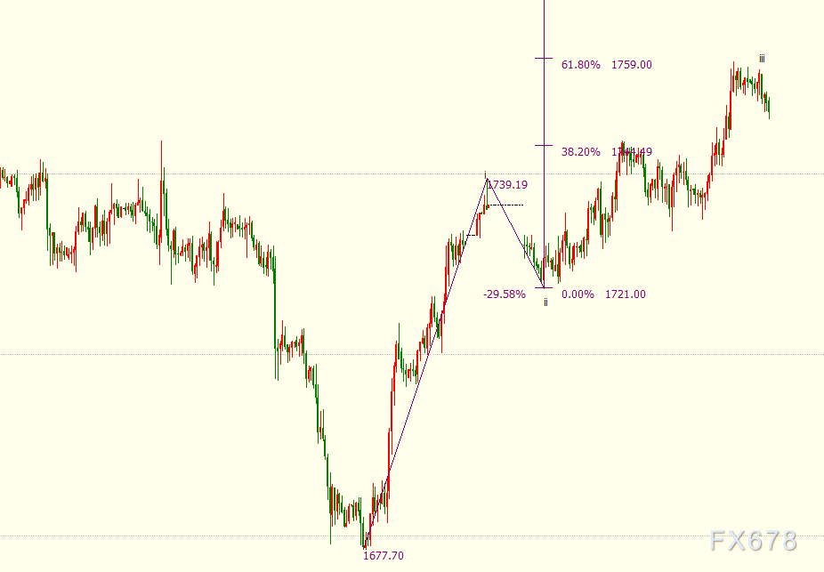 小时图上看,现货黄金处于自1721美元开启的上行iii浪中,逼近61.8%目标位1759美元,下一道阻力位上看76.4%目标位1768美元。日线图上看,金价自1677美元开启上行5浪走势。5浪是自1123美元开启上行(3)浪的子浪。