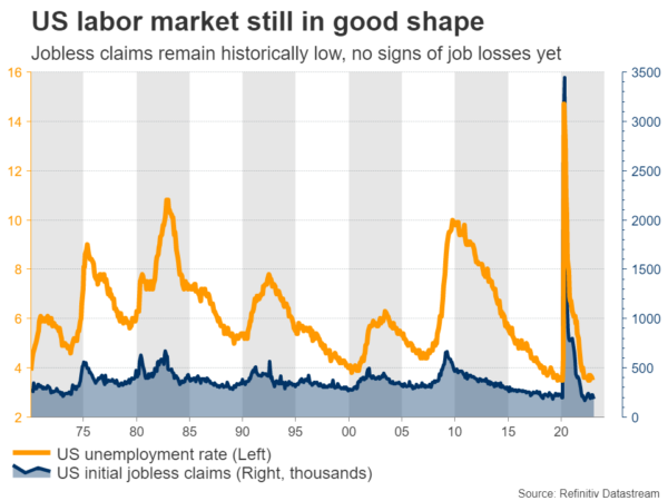 尽管有这些迹象表明劳动力市场正在降温,但在这个数据集中出现任何真正的弱点可能还为时过早,因为失业救济金的申请仍然非常低。有很多关于大规模裁员的轶事,但它还没有出现在硬数据中。