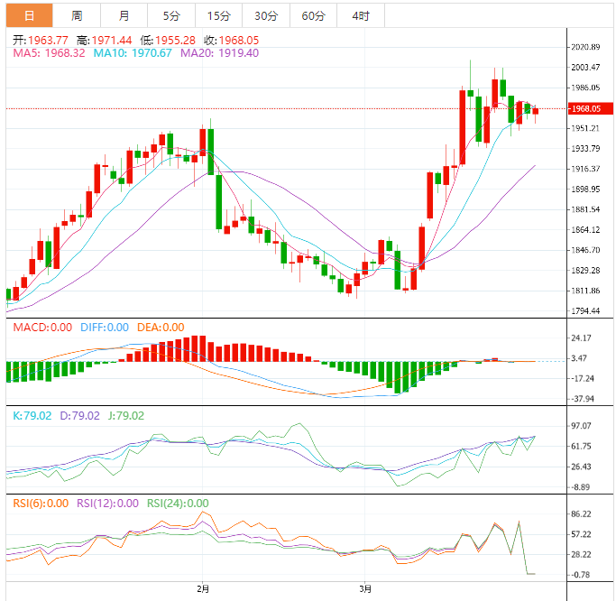 回顾一季度黄金整体行情走势:一月涨,二月跌,三月涨,月内甚至短期突破2000美元,至今天黄金年K线上涨7.4%。