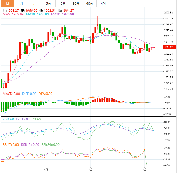 周三亚洲时段,现货黄金小幅上涨,目前交投于1960关口附近。周二(6月6日),国际金价小幅走低,但波动区间不足10美元,投资者期待美联储政策前景变得更加明朗,尽管美元走软限制了金价进一步下跌。此外,俄罗斯和乌克兰之间地缘政治紧张局势不断升级,也利好避险买盘。