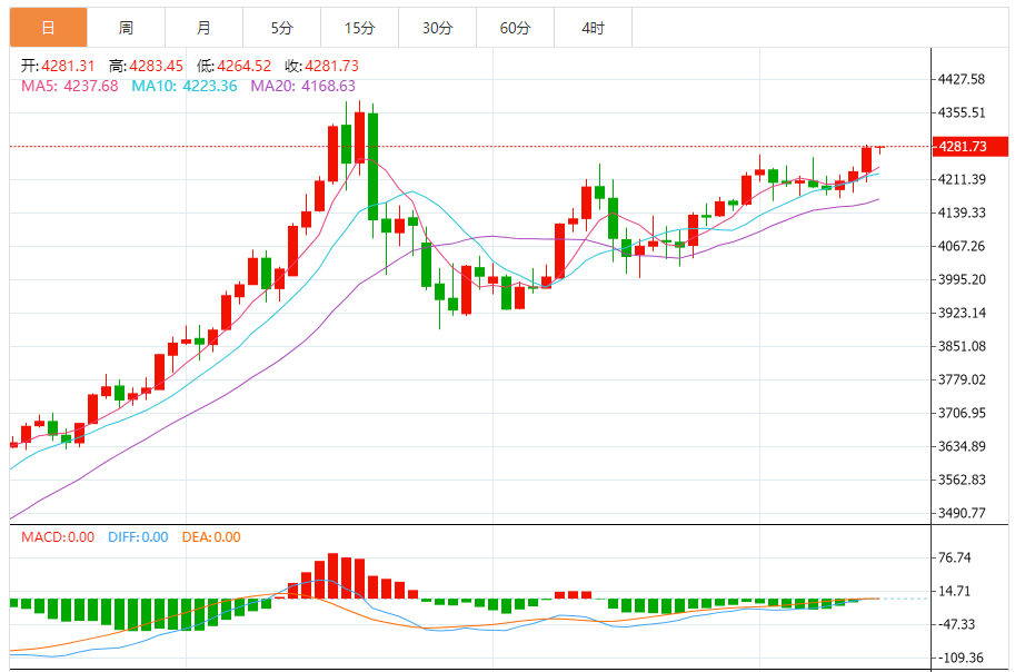 日线级别来看,黄金已形成明确的多头突破形态。现货黄金昨日以长下影阳线报收,今日延续强势并突破前期4265美元阻力区间,日线图上5日均线与10日均线维持金叉形态,且均向上穿越20日均线,形成多头排列格局。MACD指标在零轴上方金叉持续放量,红色能量柱虽略有收缩,但未改变强势特征;KDJ指标虽运行于80以上的强势区域,J值出现轻微拐头,但未形成死叉,属于高位正常震荡。值得注意的是,今日成交量随价格突破同步放大,确认了突破的有效性,避免了“无量突破”的假突破风险,日线级别目标已指向4300美元整数关口及前期高点4381美元。