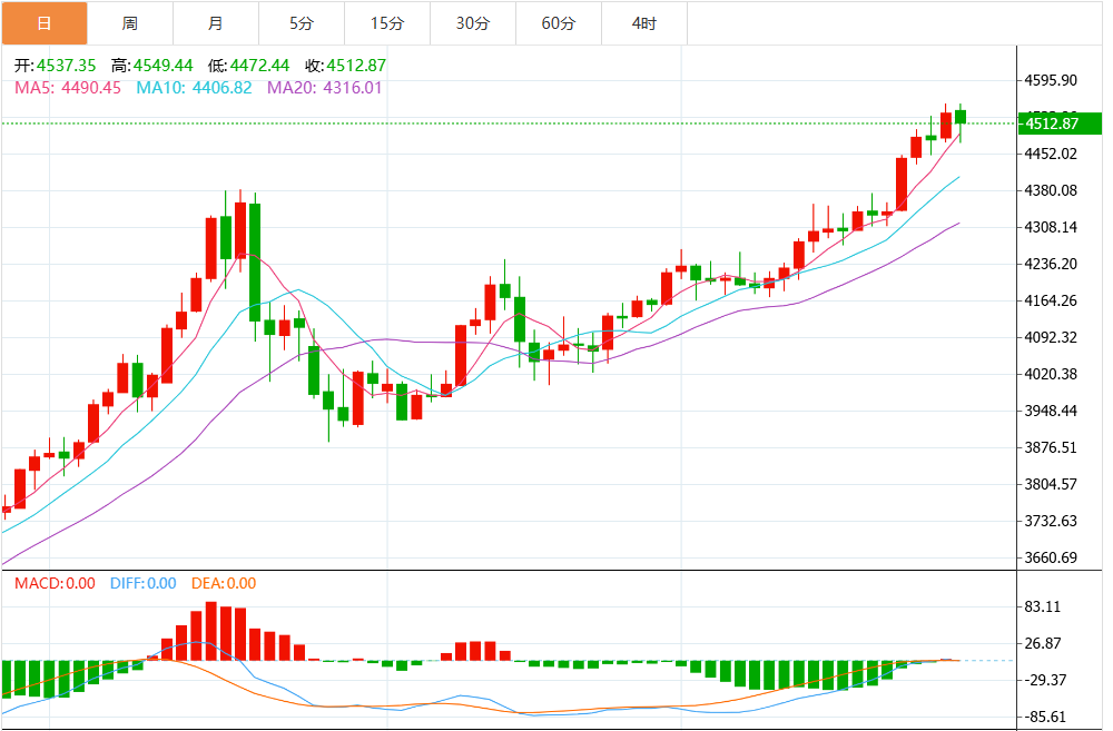 操作:4490-4500站稳做多,止损4485,目标4510-4520;4520-4530遇阻做空,止损4535,目标4500-4490。