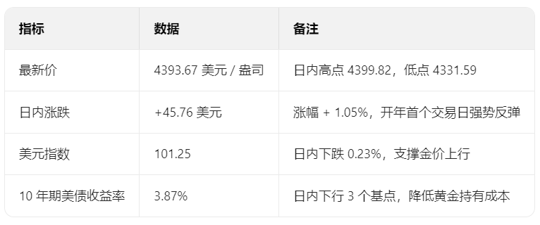 截至1月2日发稿,现货黄金报4352.8美元/盎司(+0.51%),日内呈“高开震荡偏强”格局,核心驱动为美联储降息预期、美元走弱与央行购金支撑,关键点位清晰,操作以区间交易与突破跟进结合为主,严格控制仓位与止损。