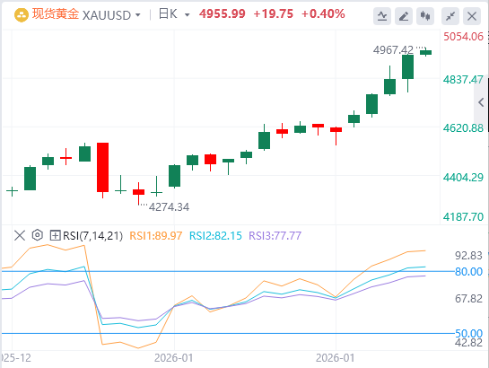 本周突破自十月底起的上升通道顶端,被视为XAU/USD多头的关键触发点,验证了近期积极前景。移动平均收敛背离线(MACD)位于信号线之上,两者均位于零上,正直方图扩大,表明多头动能增强。RSI在81.11超买,短期内可能限制涨幅,尽管突破有利于上行持续。