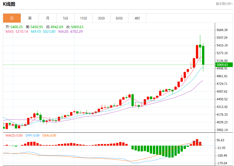4小时图显示价格距离5000美元水平较近,技术指标呈下行趋势。 移动平均趋同/背离(MACD)线显示出明显穿越信号线下方,并且负直方图在扩大,相对强弱指数(RSI)打印在43.76(中线以下为中性),进一步强化了看跌动能。