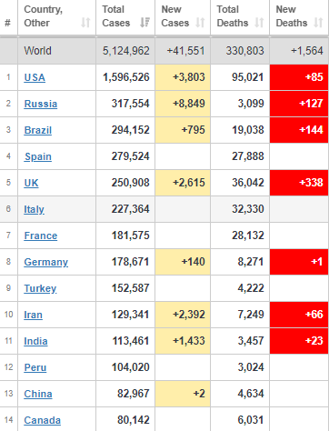 根据约翰·霍普金斯大学汇编的数据,目前这种冠状病毒已经感染了500多万人,导致全球328227人死亡。