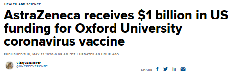 阿斯利康公司(AstraZeneca)从美国卫生部生物医学高级研究和发展管理局(BARDA)获得了超过10亿美元资金,用于从牛津大学开发一种冠状病毒疫苗。