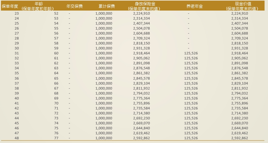 信先生30周岁,希望对自己的未来养老做好规划,为自己投保信泰如意享养老年金保险,5年交费,年交保费20万,60岁领取。本合同的保单利益演示如下: