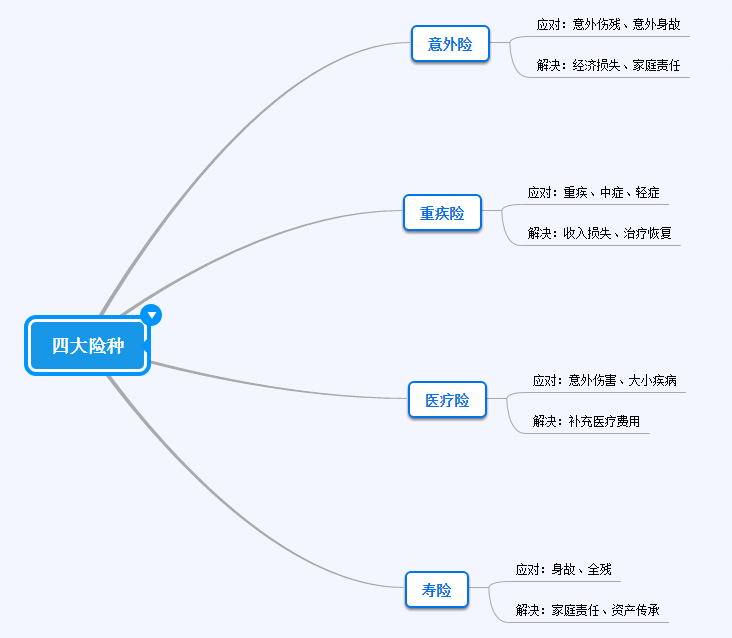 这里大家需要清楚的是,这三种风险可以细分为以下四种保险来应对:①意外险 ②重疾险 ③医疗险 ④寿险