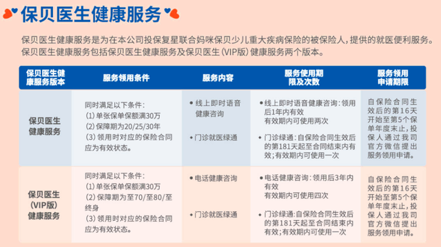 保贝医生健康服务:分为普通服务和VIP绿通服务,针对不同的保额和保险期限设定。