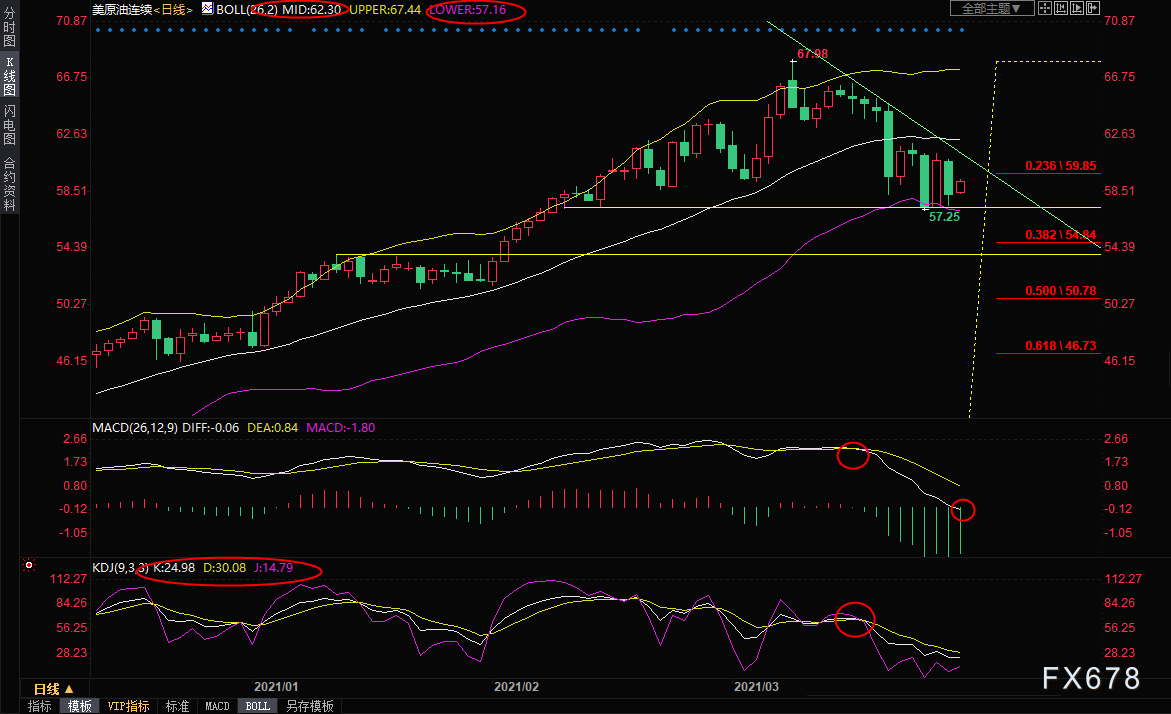 日线级别:震荡;上一交易日油价大跌,尽管布林线下轨再次给油价提供支撑,但多头的信心已经遭到极大的打击,尤其是短线下行趋势线的压制仍在,MACD死叉,KDJ死叉,需要提防油价震荡下破布林线下轨支撑的可能性,目前布林线下轨支撑在57.15附近,若下破该支撑,则油价偏向在后市跌向54.84附近,这是33.64-67.98涨势的38.2%回撤位。