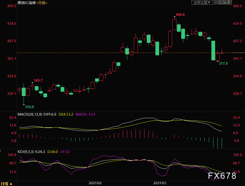 上海原油价格走高,主力合约2105终盘收于390.8元/桶,涨4.7元/桶,涨幅1.22%。