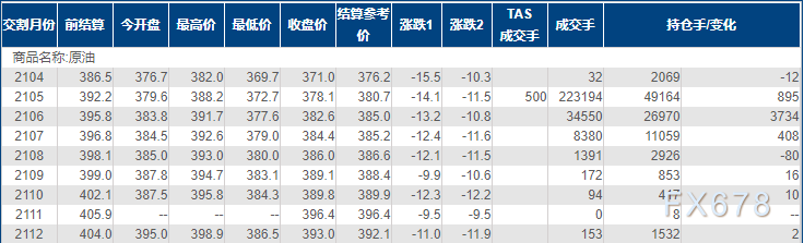 上海原油价格大跌,主力合约2105终盘收于378.1元/桶,跌14.1元/桶,跌幅3.6%。