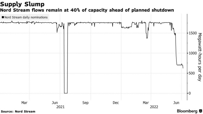 高盛最新预计,俄罗斯向欧洲输送天然气的北溪1号管道在7月份的维护完成后,可能也不会恢复满负荷运行。这一预期与德国官员此前的担忧相呼应。北溪1号将于7月11日至21日停止运行,进行常规维护。分析人士说,此举将加剧近期欧洲市场天然气短缺。俄天然气市场专家季伊万·莫宁表示,受暂时关闭消息影响,7月份“北溪-1”天然气管道供气量可能降至13亿立方米,与6月份相比降幅近60%。