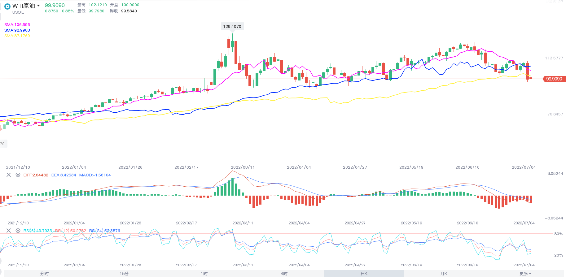 2022年上半年,投资者对供应趋紧的担忧成为提振油价走高的主要因素,开盘75.615美元。收盘报107.53美元,3月初攀升至2014年7月以来新高129.42美元。WTI均价为101.52美元/桶,较2021年上涨39.30美元/桶,或63.17%