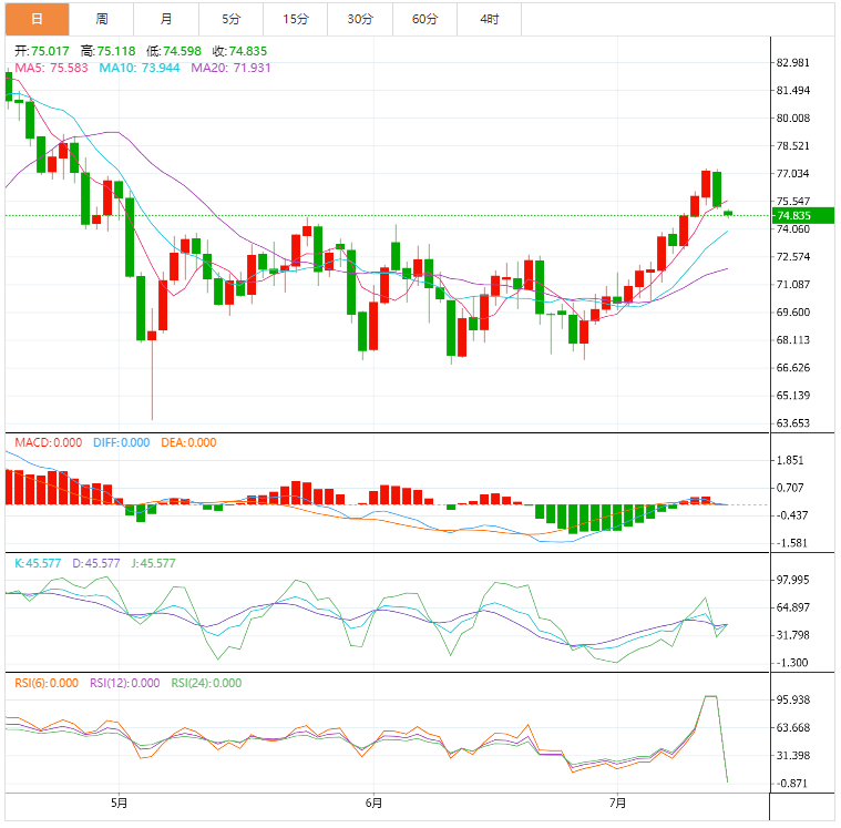 周一亚洲时段,美原油交投于74.90美元/桶附近,油价上周五回落近2.5%,因美元走强,石油交易商在强劲反弹后获利了结,美国东北部遭遇强风暴短期影响需求限制油价涨幅。