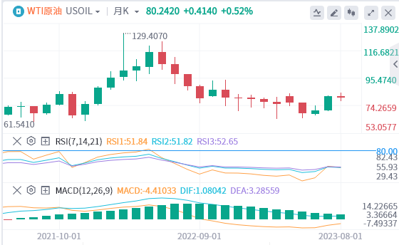 8月上旬,原油持续走高,最高触及84.32,为自7月下旬以来最长连涨时间,也攀升至接近年初的水平。市场预计美联储的货币紧缩行动尚未结束,应该会限制需求。此前由于沙特和俄罗斯的供应限制收紧了市场,原油价格在7月份上涨,但料8月将出现月度小幅下跌。Philip Nova Pte高级市场分析师普里扬卡萨赫德瓦表示:“沙特可能将减产措施延长至10月的预期,进一步支撑了油价。但在借贷成本上升的背景下,对宏观经济的担忧日益加剧,限制了油价的上行空间。”截至目前,原油徘徊在80.24附近。