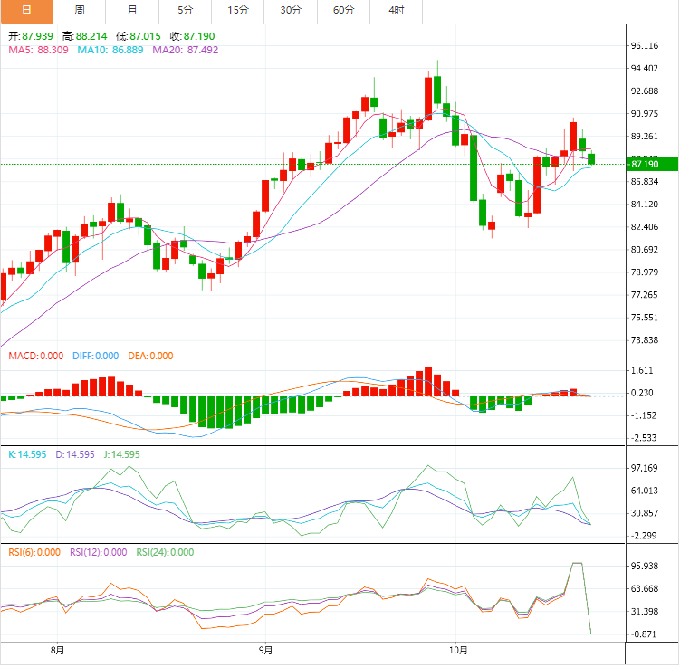 周一亚盘,原油交投于87.3019附近。油价经历了动荡的一周,部分原因是以色列 - 巴勒斯坦局势不断演变。当哈马斯释放两名美国人质时,出现了降级的希望,撤回了对石油期货定价的一些风险溢价。短期内,市场情绪倾向于看涨WTI原油,主要是由于中东地缘政治动荡和供应格局收紧。这两个因素都导致了价格上涨的压力。然而,交易者保持高度警惕至关重要。美联储利率政策的不确定性和快速的地缘政治发展可能迅速成为改变市场情绪的催化剂。