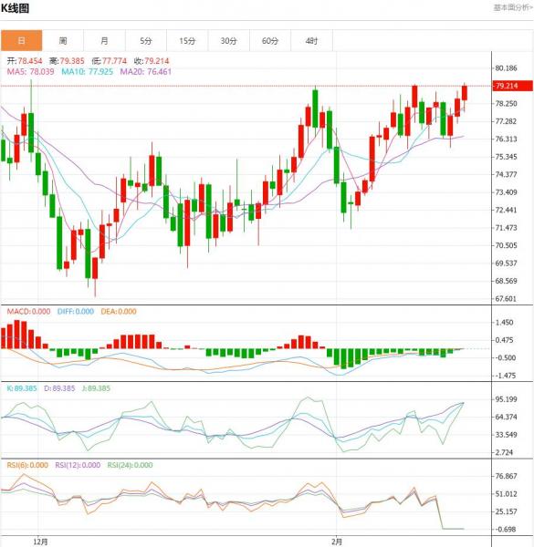 原油周二继续震荡上行,日线收阳于78.5,从日线看油价还将继续上涨,4小时图在中轨附近整理启稳后放量摸高上轨,目前刚好点到上轨处。短线看能否直接突破此前高点79.30.突破才能打开空间,同时顶开上轨,否则还会陷入在高点之下整理蓄势。